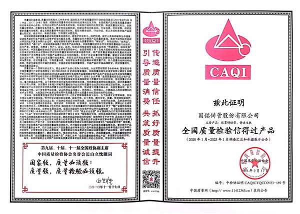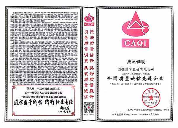 公司堅持以質量為生命,以滿足用戶需求作為自己的追求,依靠雄厚的技術力量和先進的生產、檢測設備,對生鐵、球墨鑄鐵管產品進行全過程控制,產品質量得到全面的保證